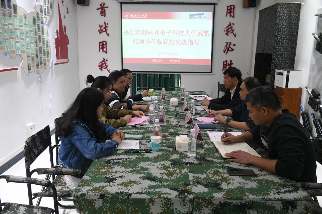 3月22日上午,桂林电子科技大学武装部副部长朱小精一行4人到我部进行调研。武装部保卫处副部(处)长黄海、武装部保卫处副部(处)长黎超业、国防教育科负责人等同志参加了交流座谈。
