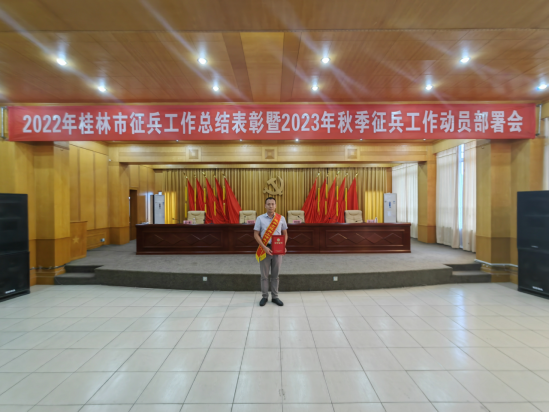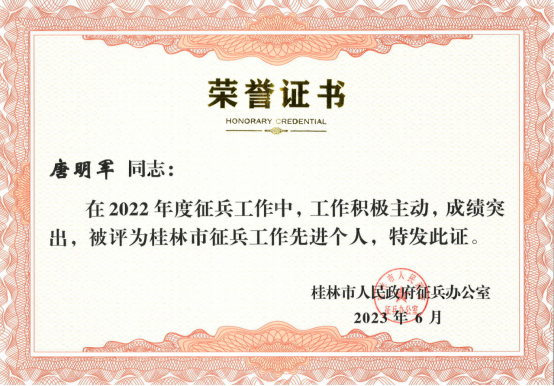 近日,桂林市召开2022年征兵工作总结表彰暨2023年秋季征兵工作动员部署会,会议上表彰了2022年度桂林市征兵工作先进集体单位和先进个人,我校太阳集团tyc138唐明军同志荣获“2022年度桂林市征兵工作先进个人”称号。