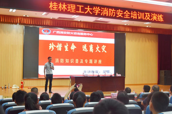 广西消安防火咨询服务中心吴震教官以“增强消防安全常识”为主题,雁山消防救援大队唐雨翔指导员以“提升消防安全技能”为主题分别为参加活动的师生上了生动的消防安全知识培训课。本次活动从安全知识培训、情景模拟演练、灭火演练、疏散帐篷使用等方面综合提升师生员工掌握应急处置技能,为有效防范化解安全风险,切实做好校园消防工作,打造安全教育平台,提高师生员工的消防安全“四个能力”奠定了基础,为形成常态化的安全教育机制和文化氛围,全力构建平安校园提供了保障。