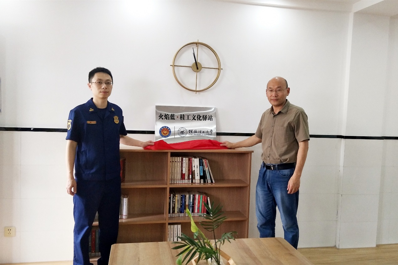 仪式上,七星区消防救援大队党委书记、教导员张祥瑞就《火焰蓝·桂工文化驿站》建设情况作了简要介绍。我校图书馆直属党支部书记、馆长张雄、武装部保卫处副部长、副处长黎超业分别代表党支部和七星区消防救援站党支部签署共建协议。随后,张雄、张祥瑞为《火焰蓝·桂工文化驿站》揭牌。最后三方代表致辞:七星区消防救援大队党委书记、教导员张祥瑞在致辞中说,《火焰蓝·桂工文化驿站》为消防救援大队提供了最好的精神食粮,优化了消防救援大队的文化资源配置,让消防员能够享受到更多的文化大餐、阅读乐趣,促进了消防队思想教育模式转型升级,希望以本次共建为开端,深化三方战略合作,推动共建共融共赢。我校图书馆直属党支部书记、馆长张雄在致辞中说,图书馆一直以来注重文化建设,致力于为读者提供更优质、更专业的服务,《火焰蓝·桂工文化驿站》是基层党建工作的新探索,图书馆将全力支持共建、定期提供图书、做好工作对接,希望以本次共建为契机,共同探索党建工作新模式,共建共享共成长,互帮互助共提高。我校武装部保卫处副部长、副处长黎超业表示,此次签约意义重大,各方将充分发挥各自优势,进行资源互补,希望今后可以全面加强联系对接,互帮互助,携手共进。