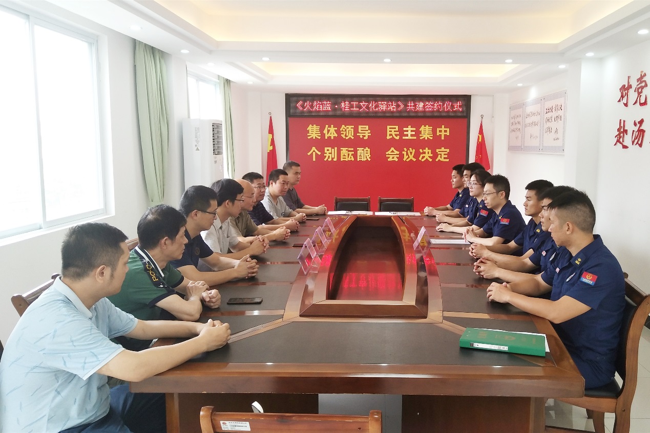 2022年6月10日上午,我校图书馆、武装部保卫处与桂林市七星区消防救援站在七星区消防救援站三楼会议室举行《火焰蓝·桂工文化驿站》共建签约暨揭牌仪式。七星区消防救援大队党委书记、教导员张祥瑞及消防救援代表,我校图书馆直属党支部书记、馆长张雄,支部副书记、副馆长郭自宽、武装部保卫处副部长、副处长黎超业及相关部门代表人员出席签约暨揭牌仪式。