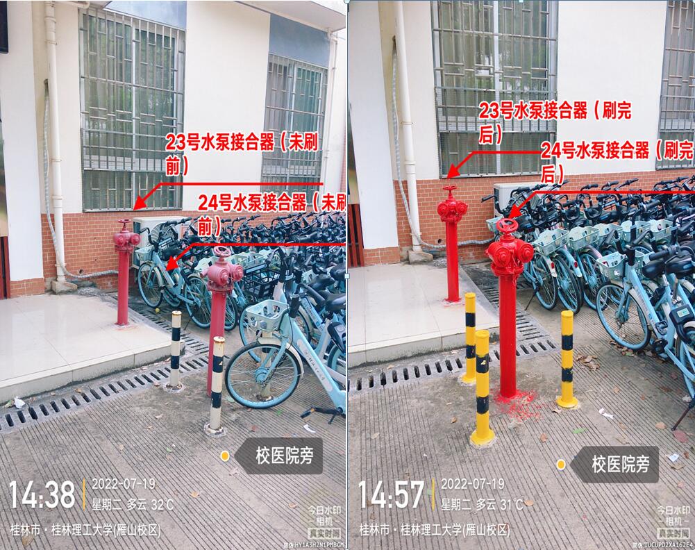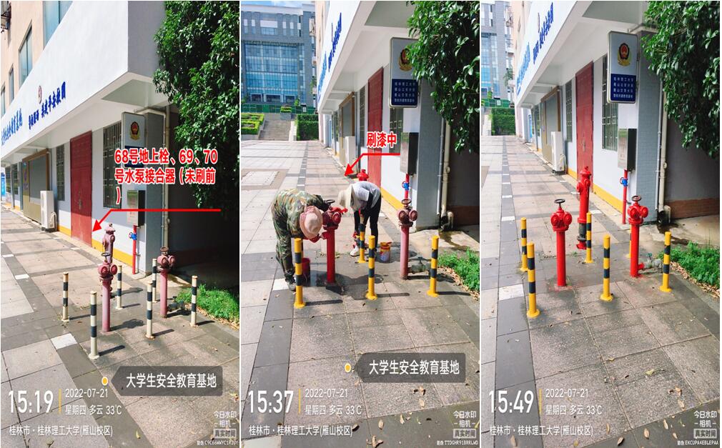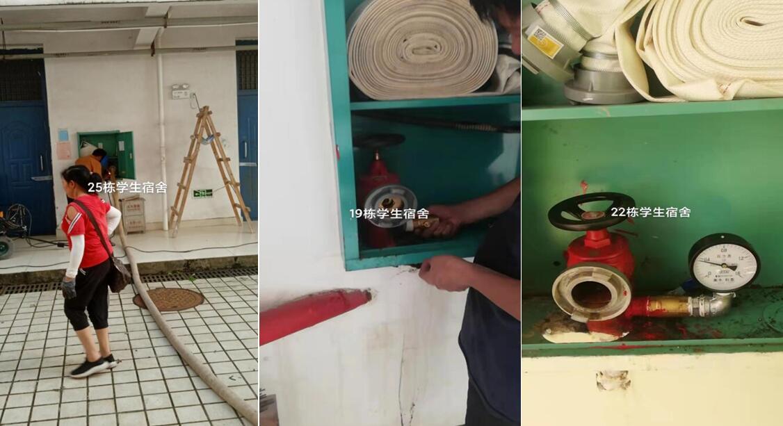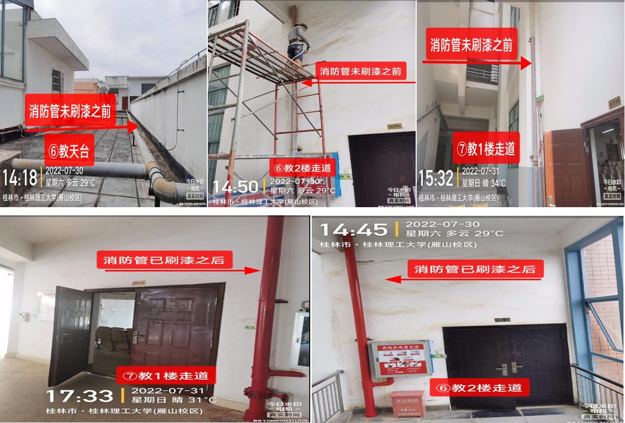 苦干实干,扎实推进。暑期高温给项目施工带来了较大困难。为确保项目质量和进度,科室加强全过程监管,号召大家发扬“特别能吃苦、特别能战斗、特别能奉献”的精神,克服困难抢工期、抓质量、保安全。施工阶段,陆大木、李路喜、彭智勇等同志不论工作日还是周末,连续十五天坚持到工地检查项目进度,为降低停水对居民的影响,多次在0点以后施工,虽然在放假期间,但是“五加二”、“白加黑”已是暑期消防工作的常态。此次施工共完成5套室内消防栓加装、1套室外消防栓改造、加装消防压力表106套、对室外消防栓除锈上漆104套、对教学楼和学生宿舍等20个楼栋进行消防管道除锈上漆,初步改变了我校消防设施设计不足及老化的状况。