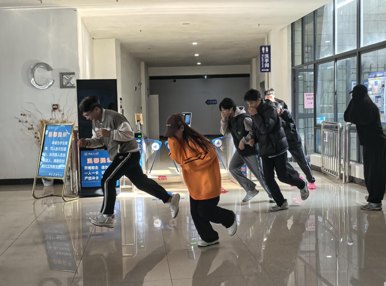讲座结束后,紧张而有序的“师生安全疏散演练”随即展开。在保卫处工作人员的引导下,学生们迅速按照既定疏散路线,采取俯身低姿、捂住口鼻的正确逃生姿势,沿着指定的安全通道迅速撤离至安全区域。