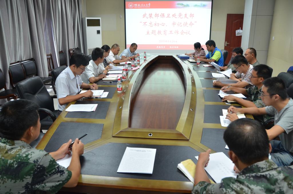 支部纪检委员黎超业同志结合《武装保卫处党支部“不忘初心、牢记使命”主题教育方案》进行了工作部署,支部书记冯广辉同志代表党支部对此次主题教育活动的开展细节进行了详细说明,并提出三点意见:一是要找准定位,明确守初心担使命的航向标,要通过此次主题教育活动,培养我校武装保卫干部“五种能力”,以适应新时代对武装保卫干部基本素质和能力的要求;二是要抓牢重点,练就肯担当重执行的硬肩膀,要把高标准高要求贯穿学习教育全过程,在守初心中铸忠诚,在担使命中重执行,在找差距中补短板,在抓落实中见成效;三是聚焦效果,干出聚人心促发展的新成绩,把高标准树立起来,把严要求落实下去,在知行合一中担当作为,推动主题教育取得扎实成效。